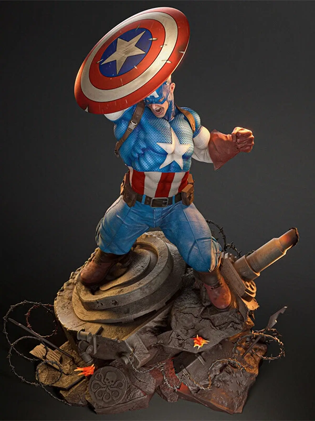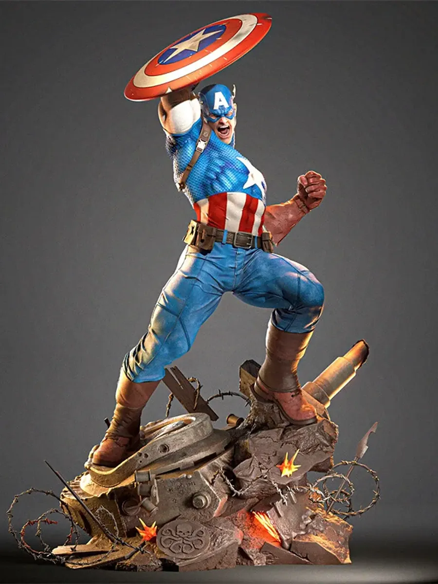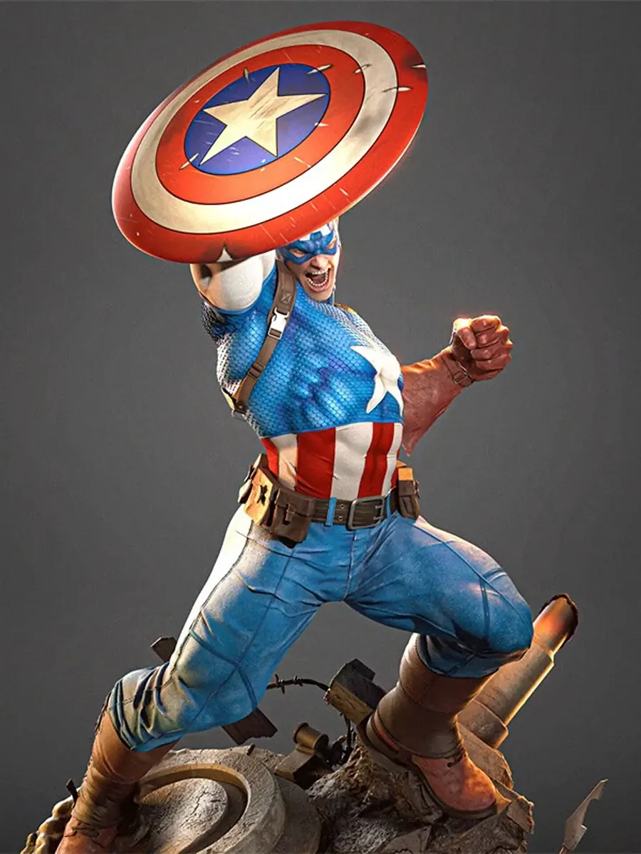 Premium Captain America resin statue in dynamic battle pose. 1/6 scale, 3D printed and hand-painted by Baka Studios. Limited edition collectible.
