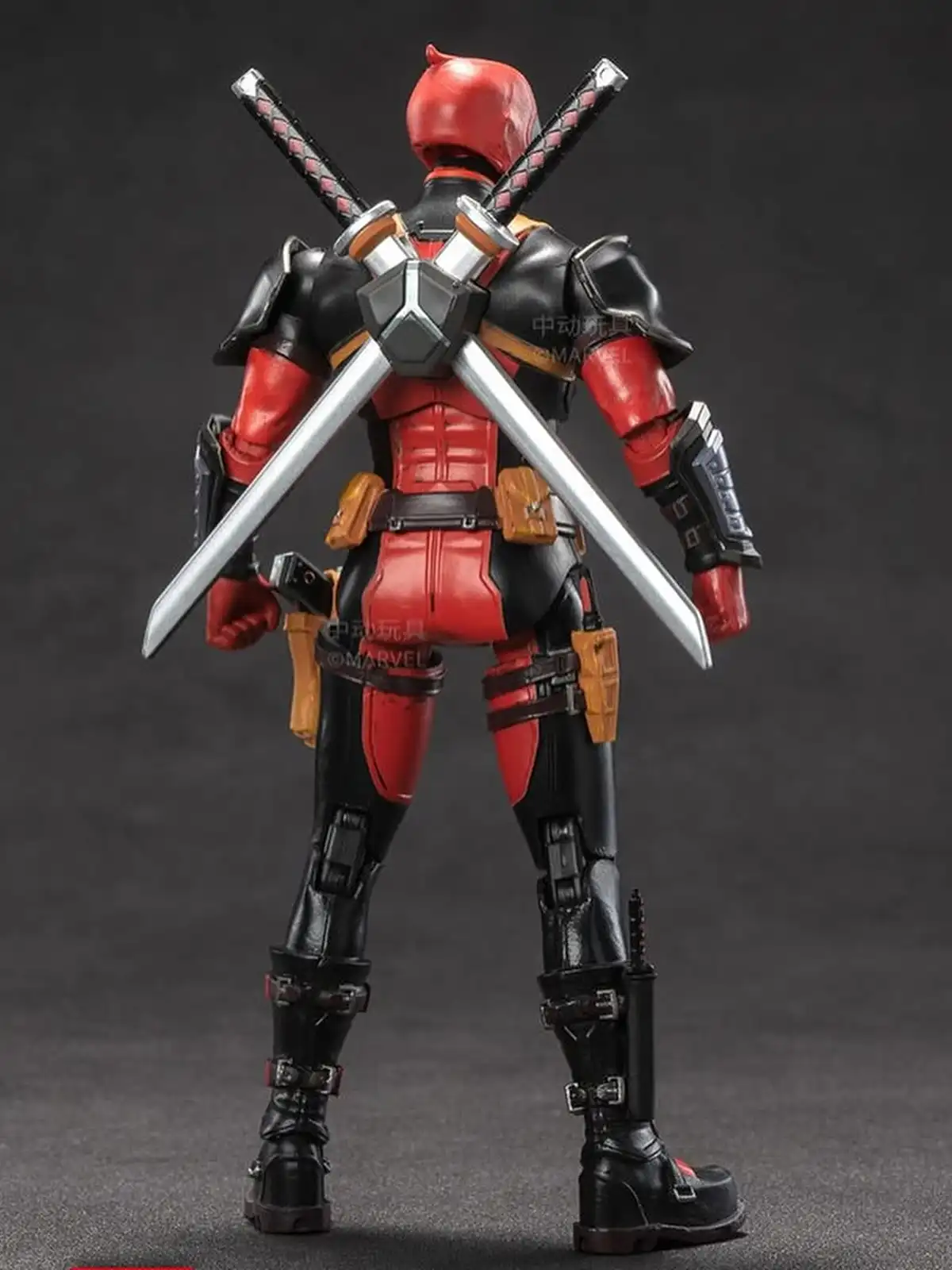 Deadpool movable action figure with dual katana swords. Fully articulated Marvel collectible, perfect for dynamic poses and display.