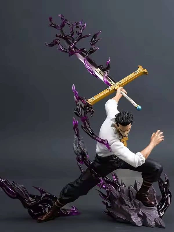Unleash the World’s Strongest Swordsman! This breathtaking Dracule Mihawk statue captures him in a dynamic attack pose, surrounded by a stunning purple energy slash effect.