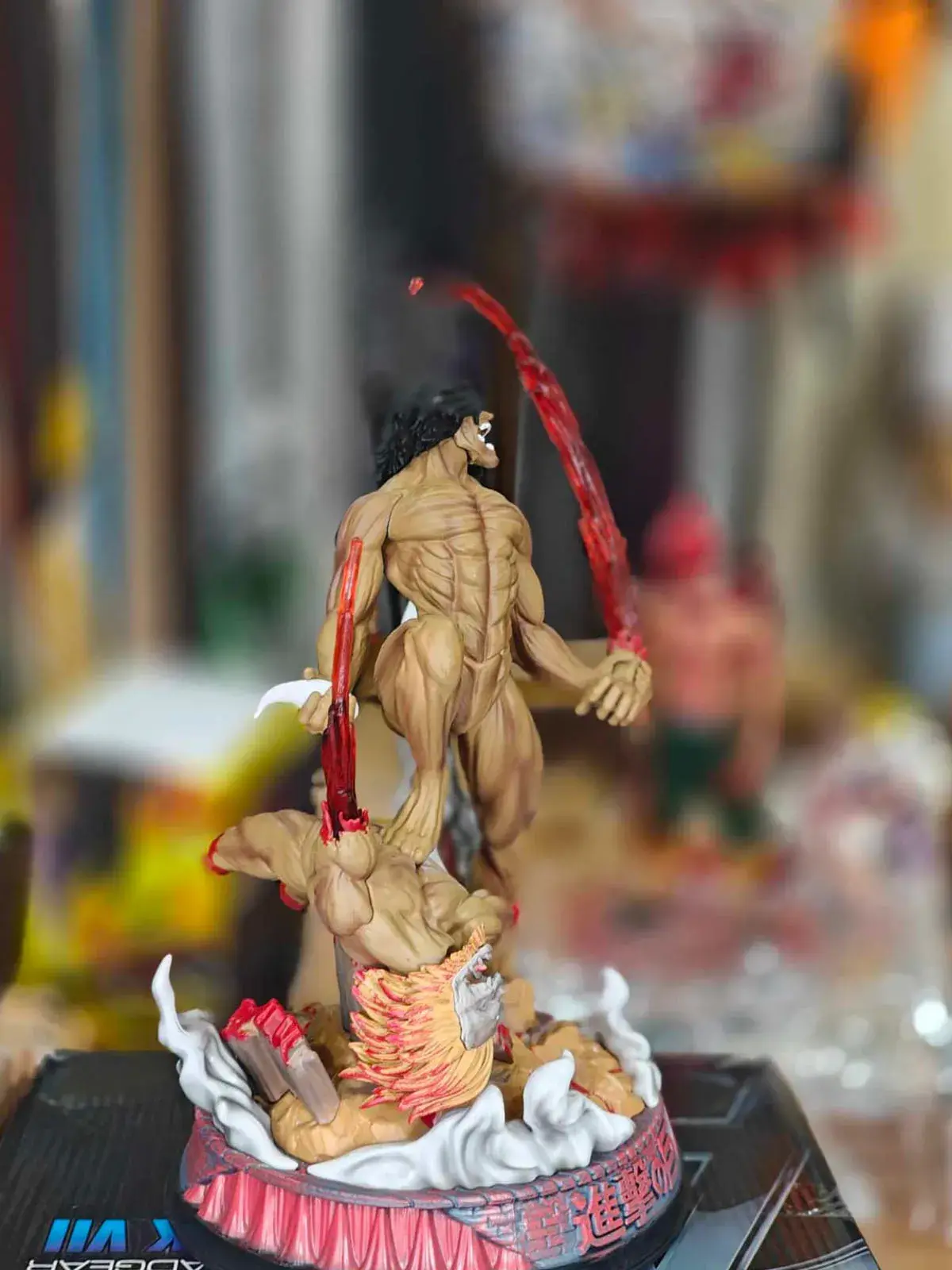 Epic Attack on Titan statue showcasing the fierce battle between Erenās Attack Titan and the Armored Titan, captured in a highly detailed and dynamic diorama with blood, energy effects, and a battlefield base.
