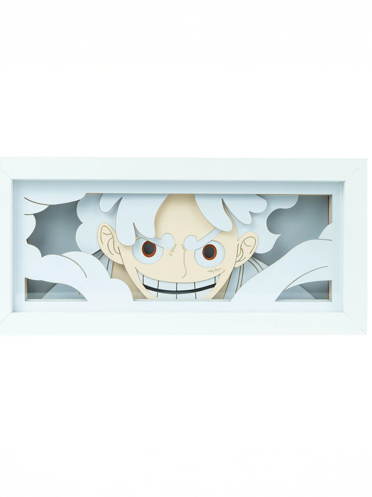 Dynamic Luffy Gear 5 LED Shadow Box with glowing eyes and multi-layered art, capturing his iconic awakened form.