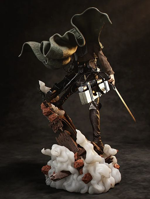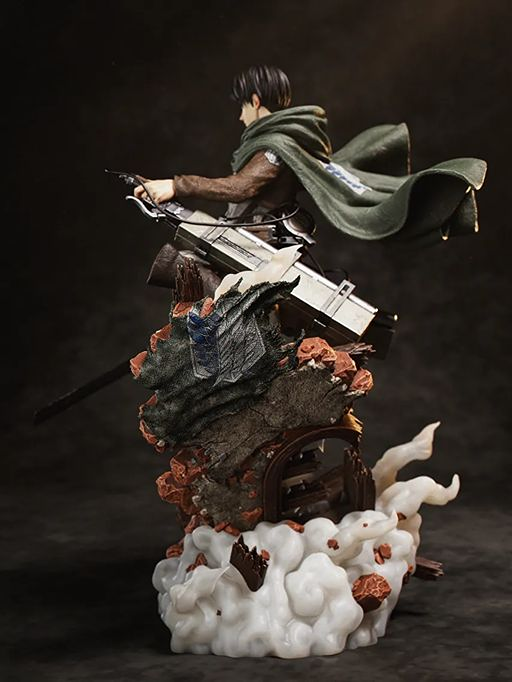 The statue features Levi equipped with his ODM gear, surrounded by dynamic motion elements that reflect his speed and agility in battle. From the flowing cloak to the sharp blade details, every aspect is carefully sculpted to match his iconic look from the series.