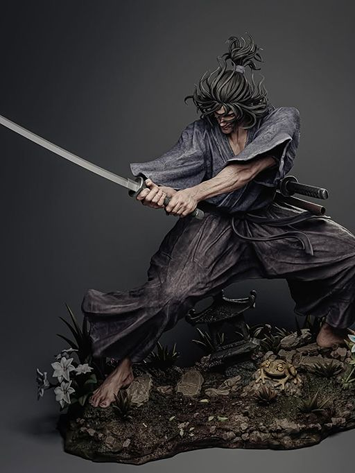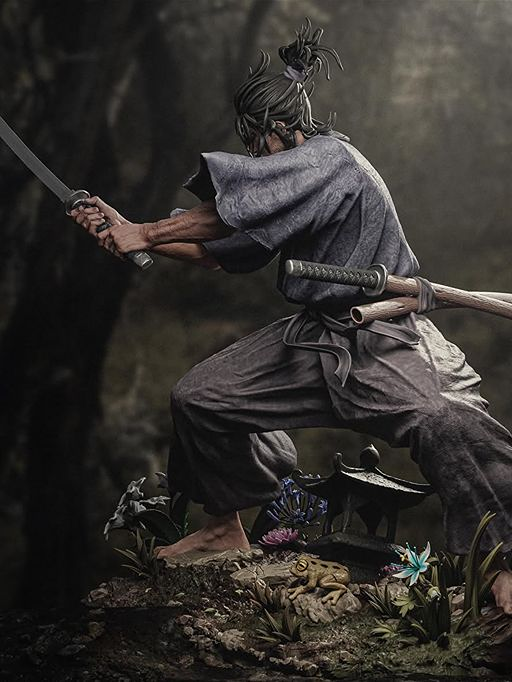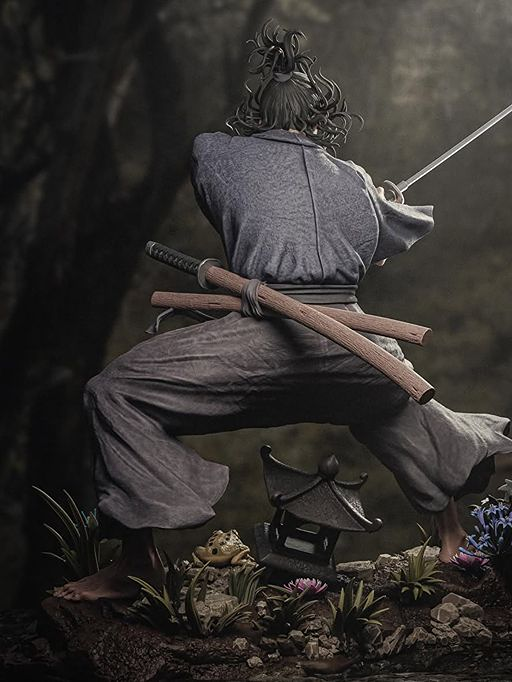 The statue features incredible craftsmanship, from the flowing robes and realistic fabric textures to the finely sculpted katana blades and intense expression. The dynamic pose reflects a moment of combat readiness, while the detailed baseāwith natural elements like rocks, plants, and traditional sceneryāadds depth and storytelling to the display.