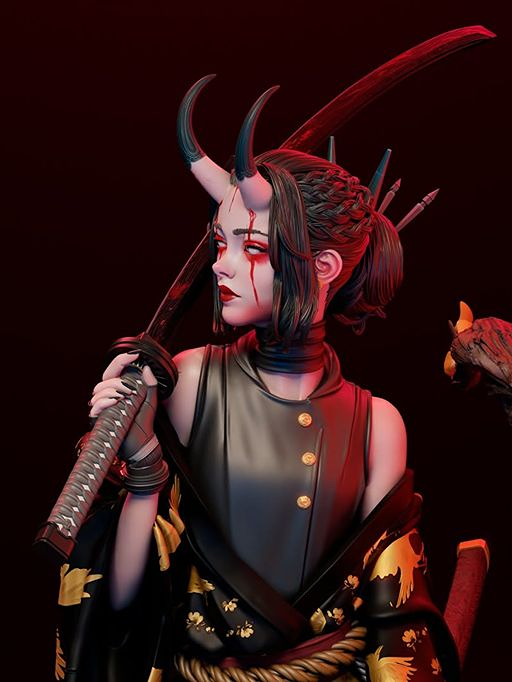 The figure showcases exquisite detailingāfrom the flowing kimono adorned with intricate patterns to the sharp katana and horned headpiece that adds a supernatural edge. The swirling base, tree elements, and atmospheric red accents create a cinematic scene that feels both serene and intense.