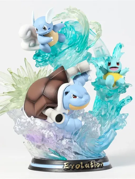 Dive into the world of water-type Pokémon with this beautifully designed Blastoise evolution statue, featuring Squirtle, Wartortle, and Blastoise in one powerful display.