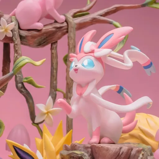 A beautifully detailed Pokémon Eevee family statue featuring Eevee and all its evolutions in a vibrant nature-themed display. Perfect for collectors and fans.