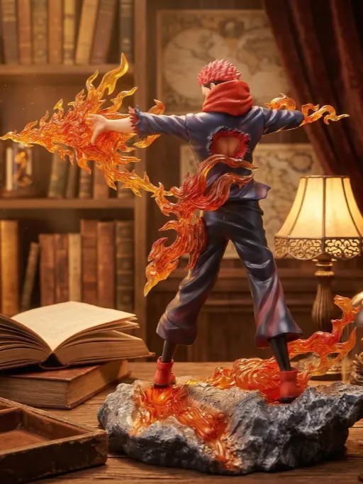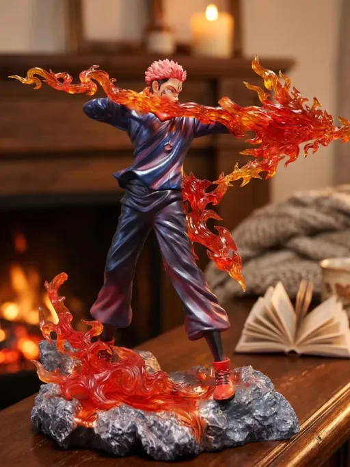 High-detail Sukuna figure with dynamic flame effects, showcasing his cursed energy in a powerful battle pose. Perfect for collectors and anime fans.