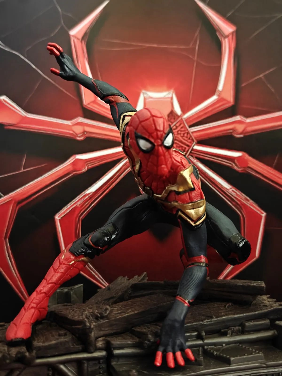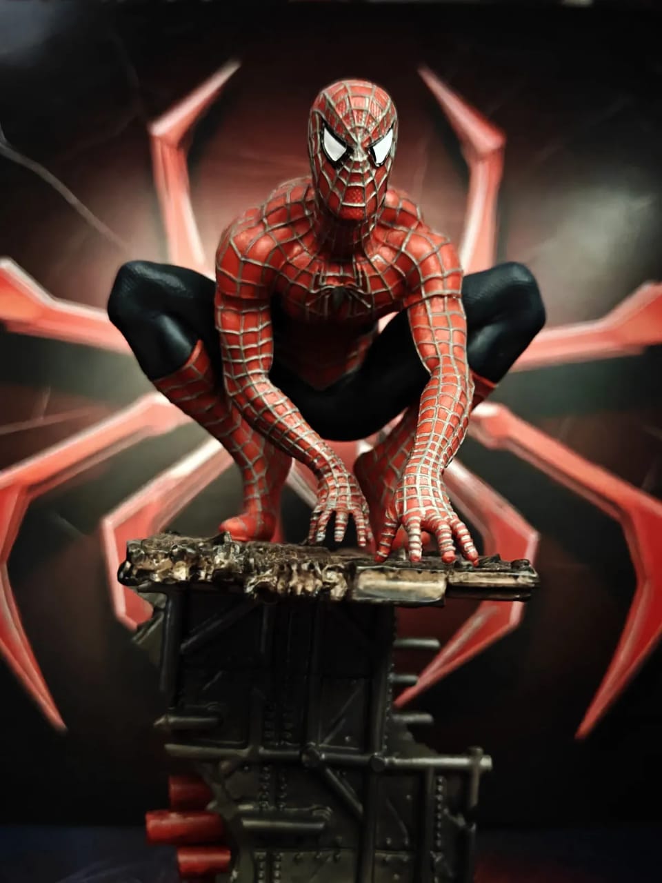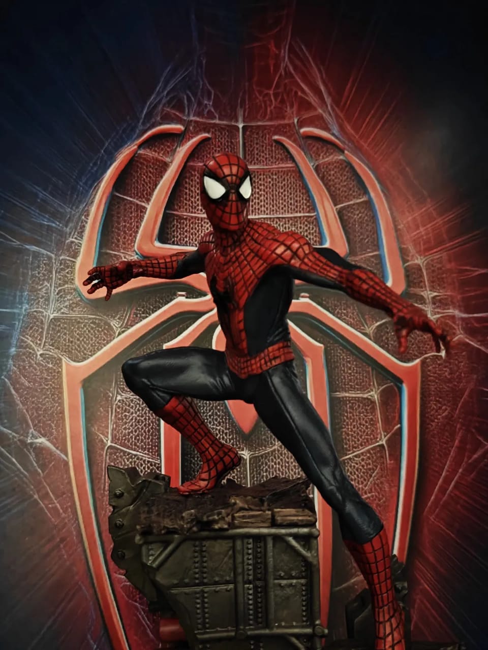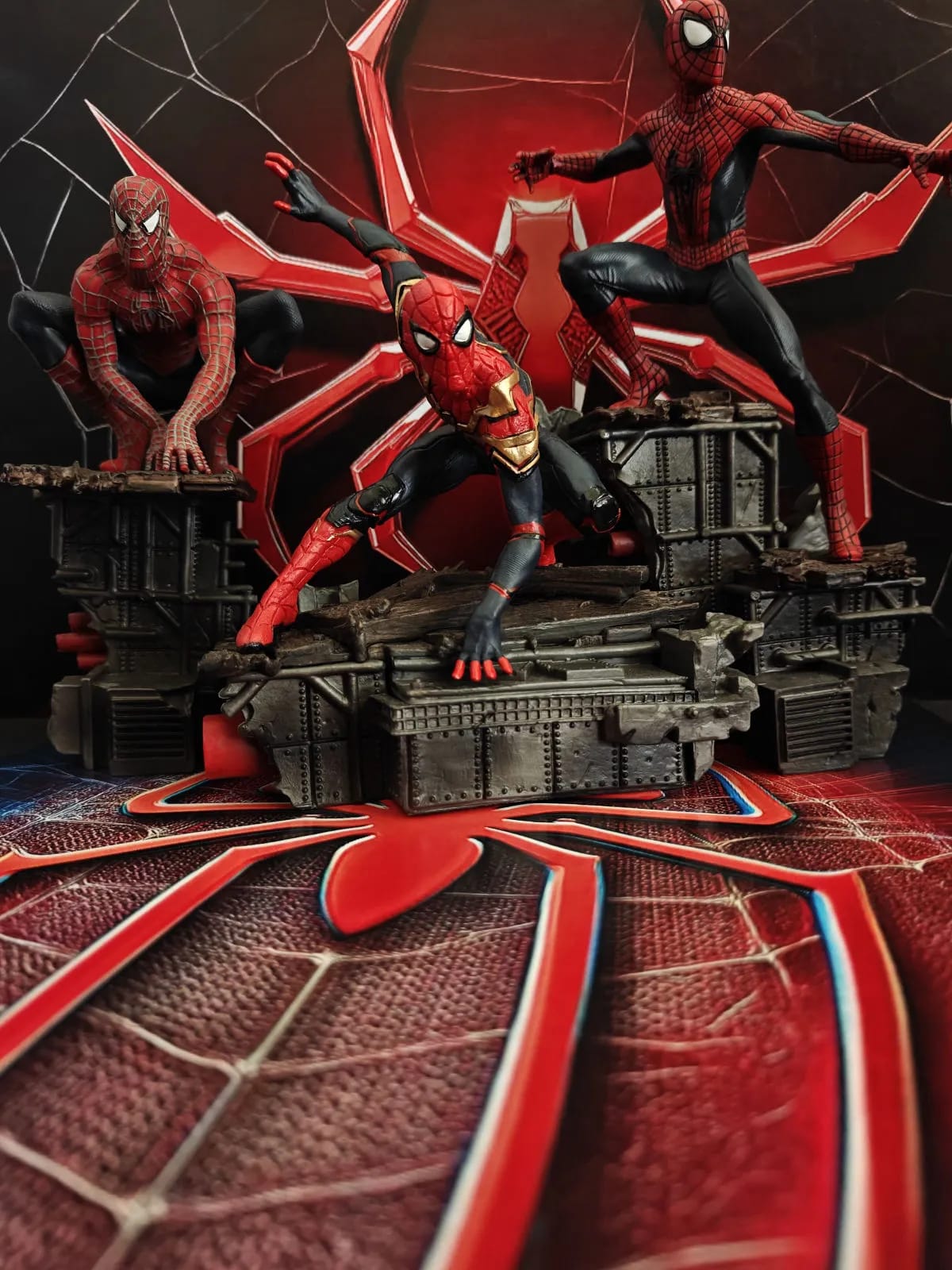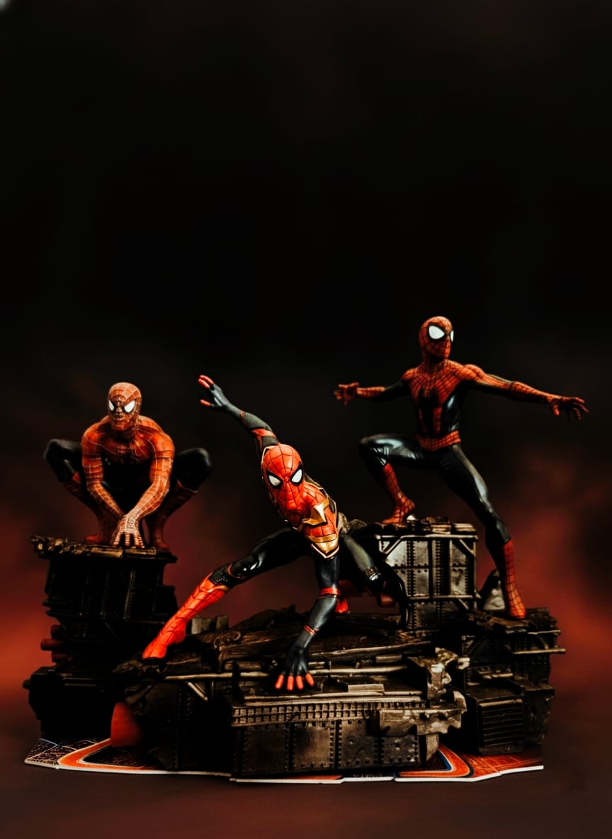 Every detail is brought to life, from the intricate web patterns on each suit to the highly detailed, battle-damaged base they stand on. Set against a dramatic, glowing backdrop, this piece perfectly captures the energy and emotion of their epic final battle.
