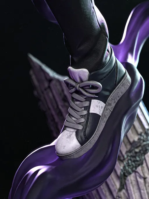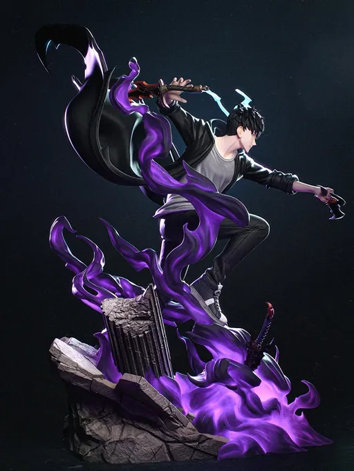 Unleash the power of the Shadow Monarch with this breathtaking Sung Jin-Woo 3D Printed Resin Statue by BAKA Studios, inspired by the globally popular series Solo Leveling. Capturing Jin-Woo in a high-action pose, this statue showcases his signature dual-dagger combat style, surrounded by swirling purple shadow energy.